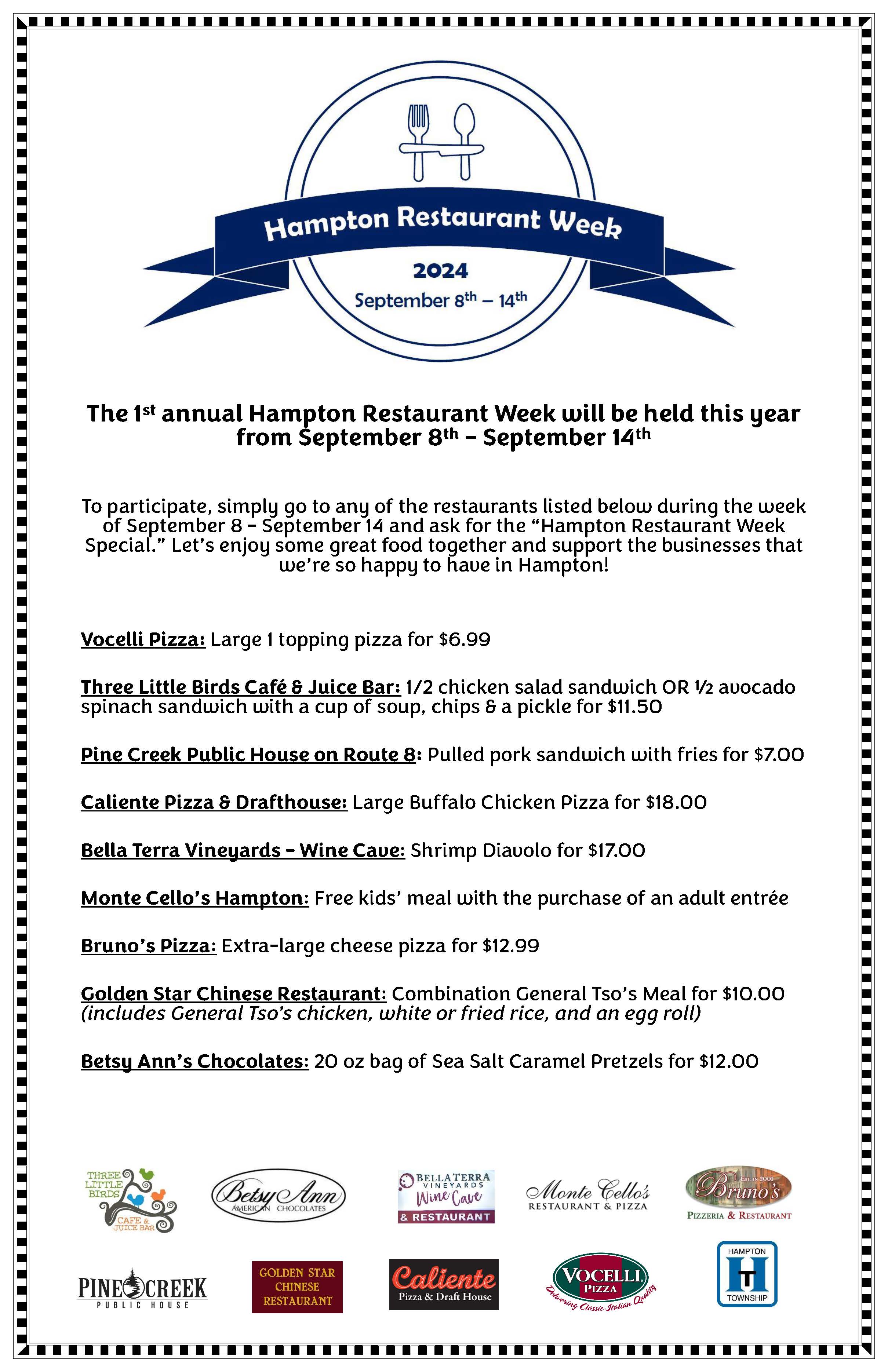 It's here! Hampton Restaurant Week has arrived. This week only (through September 14th) you can visit any of the restaurants listed on the attached flyer and ask for the "Hampton Restaurant Week Special" to get the corresponding item and price. We hope you take part and enjoy!